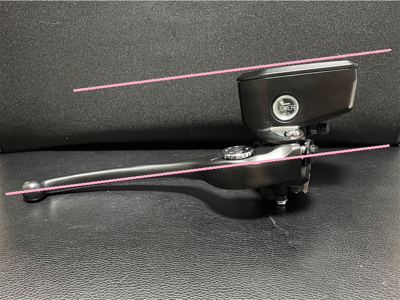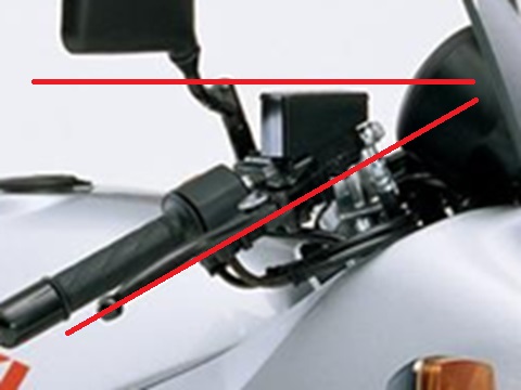 純正のマスターシリンダーはタンクに角度が付いていて、垂れ角のあるハンドルに取り付けると、マスターシリンダーが水平になります。